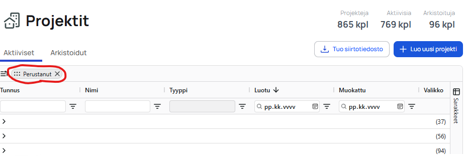 - Projektiluettelossa projekteja voi lajitella luontipäivän mukaan
