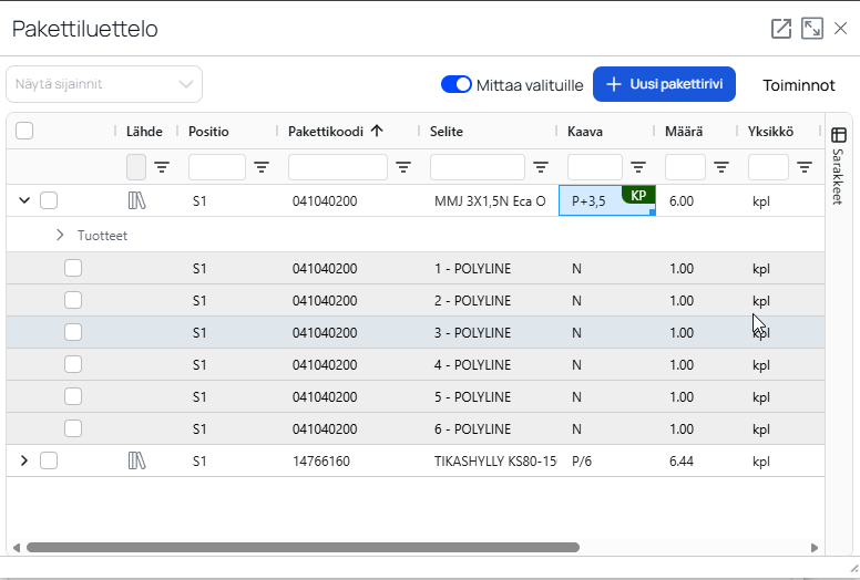 - Määrä- ja pakettiluetteloissa voi nyt hyödyntään mittauksille kaavan ja yksikön excelmäistä solukopiointia.