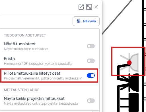 - Toiminto asetataan päälle Mittaus-ikkunan näkymä valikossa "Piilota mittauksille liitetyt osat", jonka jälkeen valinnassa olleet osat piilotetaan pdf:stä ja ne eivät ole enää mukana seuraavissa haussa