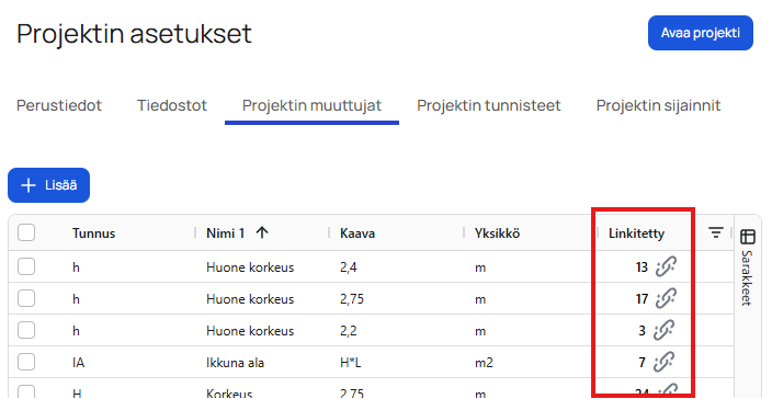 - Projektin asetuksissa Muuttujat listassa näyttetään nyt myös linkki mittauslistaan, jossa kyseistä muuttujaa on käytetty. Tämä nopeuttaa näkemään, että mihin mittauksiin muuttuja vaikuttaa.