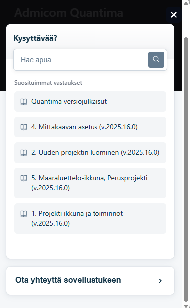 Uusi tuki widgetti käynnistyy yläpalkista kysymysmerkistä.
