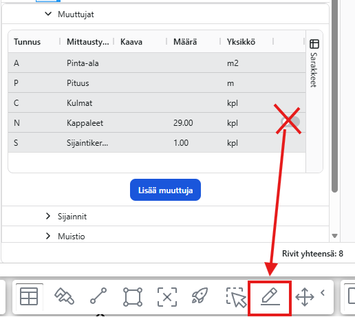 - Mittauksen muuttujat (harmaat rivit) toimivat oletuksena määräluettelon kaava kentässä