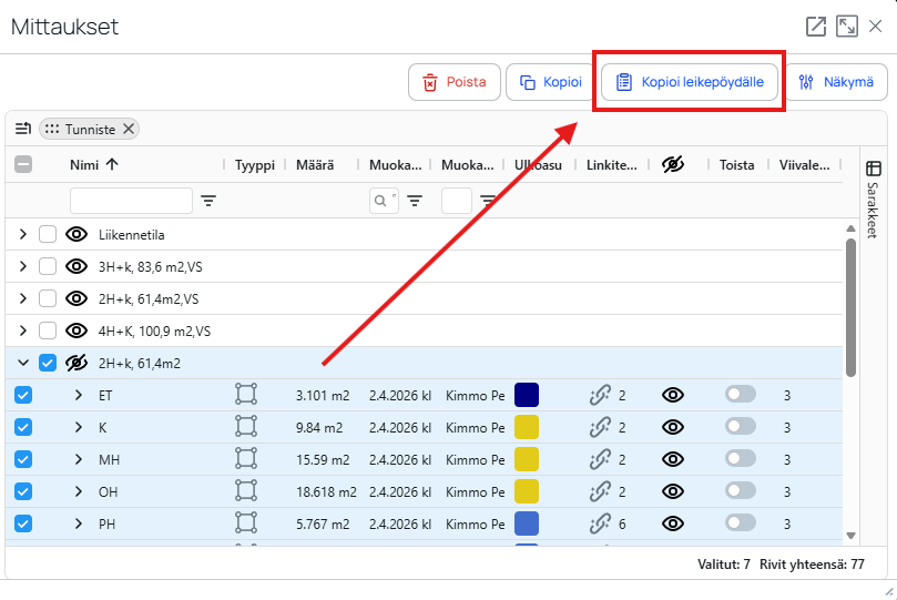 Valitset kopioitavat mittaukset mittaukset luettelossa ja valitse Kopioi mittaukset leikepöydälle
