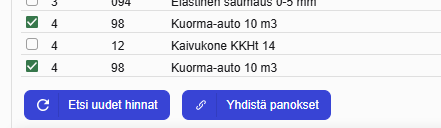- Ominaisuus: Lisätty "Yhdistä panokset"-toiminto hankkeen Panokset-näkymään. Toimintoa voi käyttää yhdistelemään duplikaattipanoksia, mikäli niillä on sama panoslaji, alentamaton hinta ja yksikkö. Nappi tulee esiin valitsemalla (täppäämällä) yhteensopivat panokset.