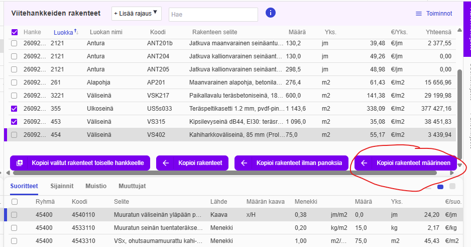 - Ominaisuus: Lisätty Rakennekirjastoon "Kopioi rakenne määrineen"-toiminto. Määrät menevät oletussijainnille *. Nappi tulee esiin, kun rakenne on valittu (täpätty.)