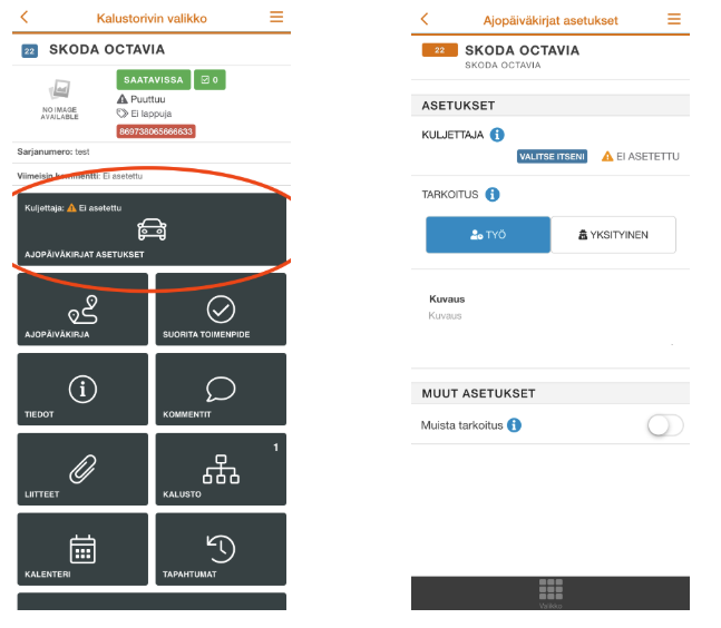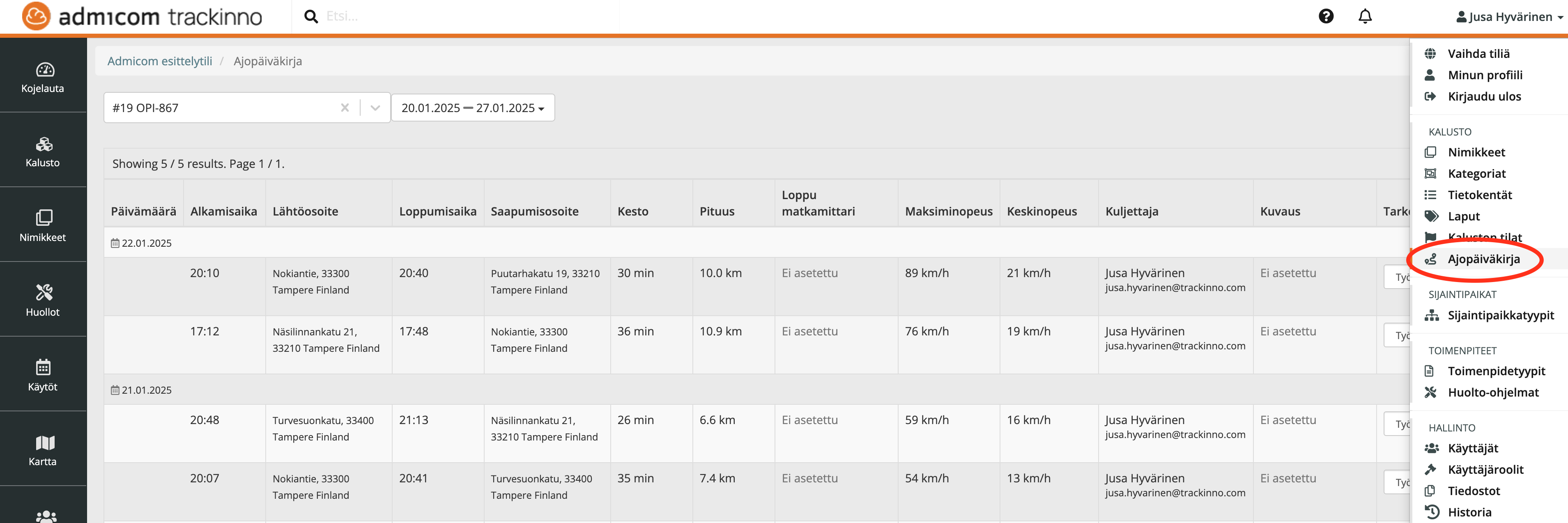 - Avaa oikean yläkulman valikosta Ajopäiväkirja.