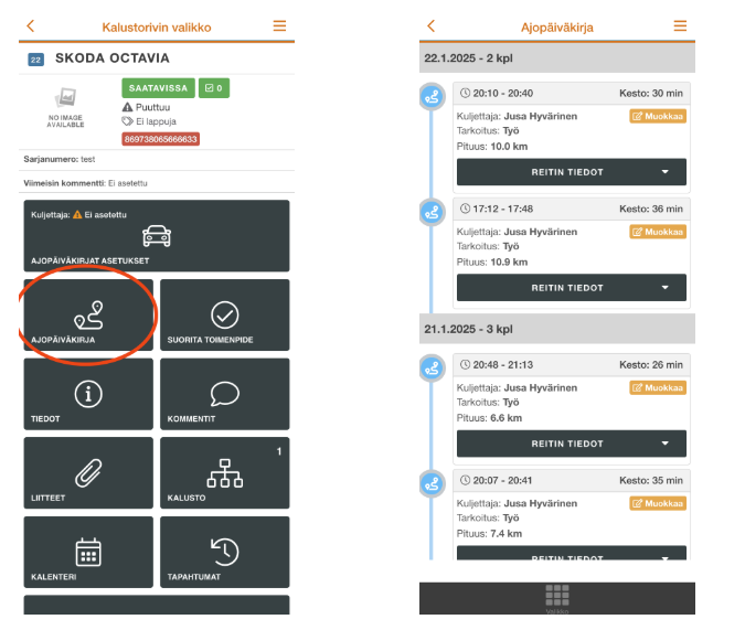 - Avaa Ajopäiväkirja nähdäksesi ajoneuvolla ajetut reitit.