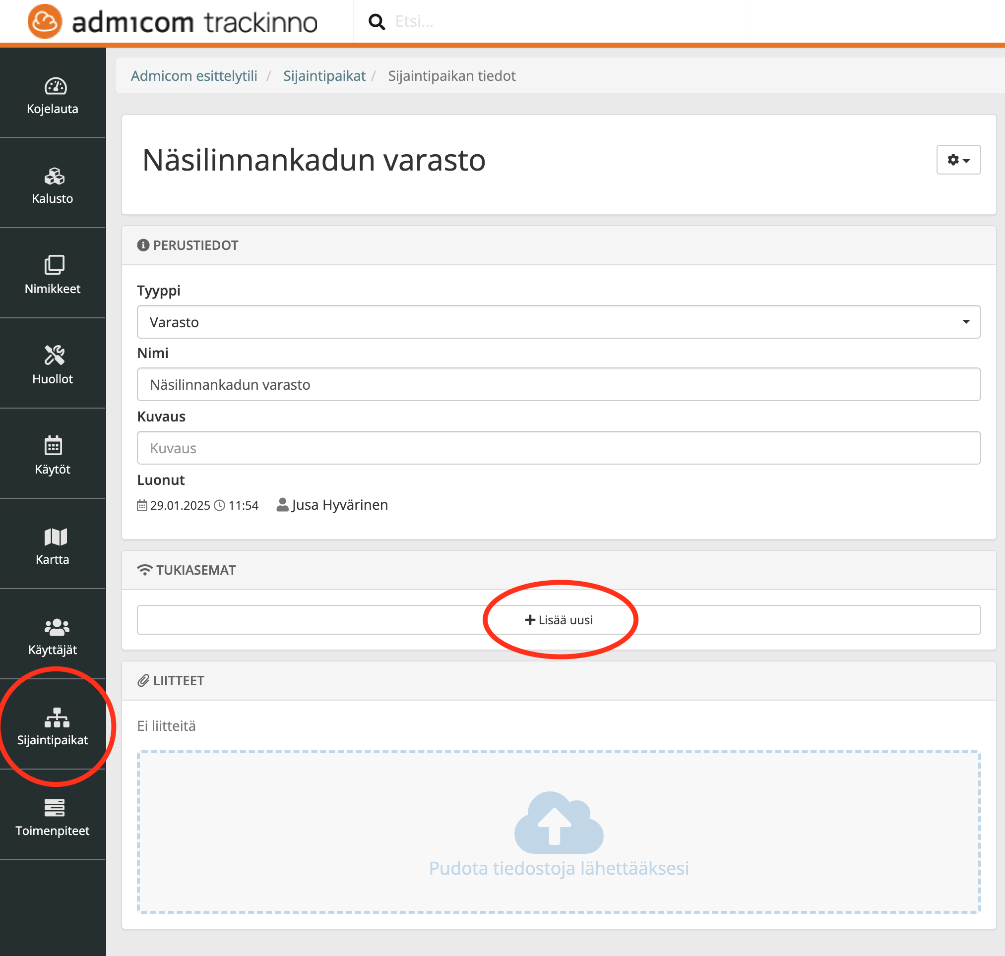 - Valitse sijaintipaikan sivulta Tukiasemat ja paina Lisää uusi.