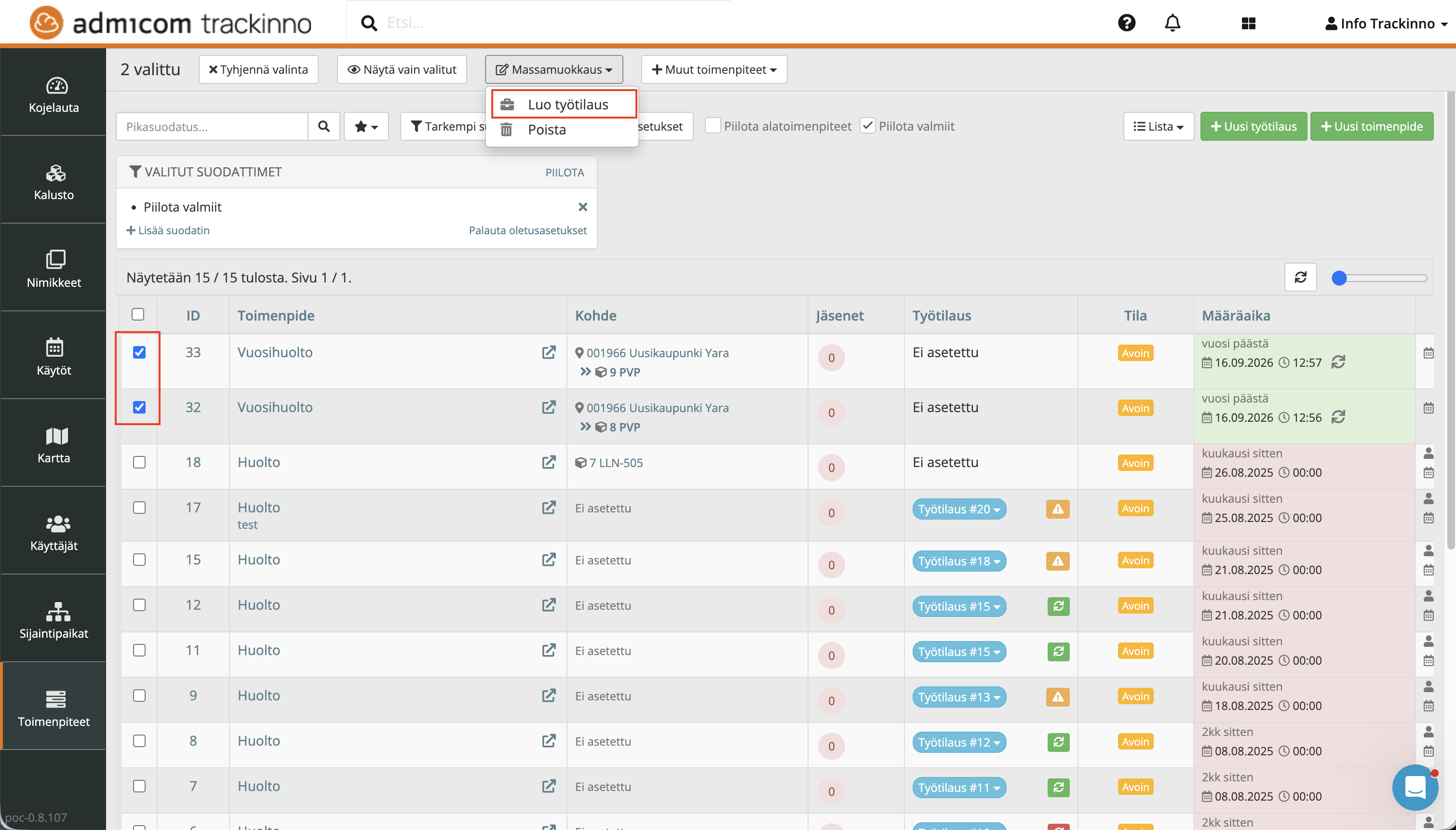 - Avaa huollettavat kohteet Trackinnoon kohteen takana olevasta painikkeesta.