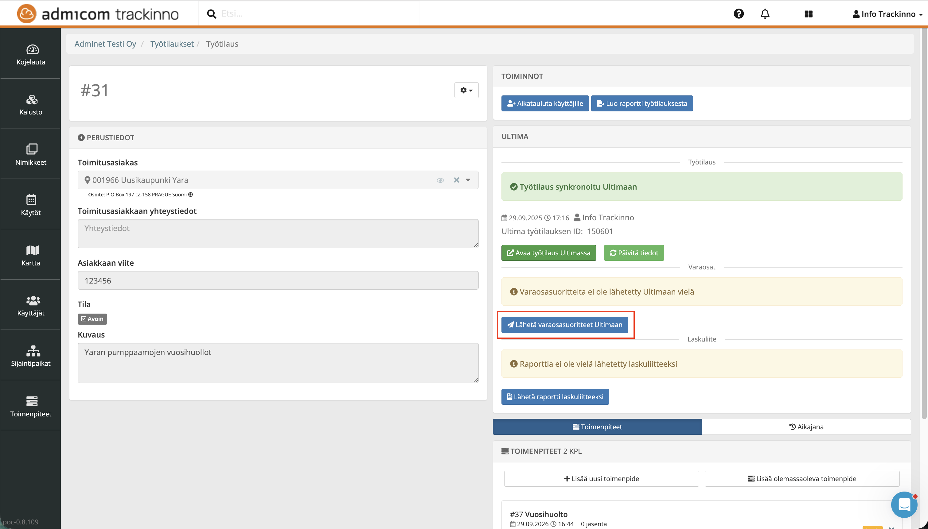 - Huomio: lähetyksen jälkeen varaosasuoritteita ei voi enää muokata Trackinnossa – tee mahdolliset korjaukset Ultimassa.