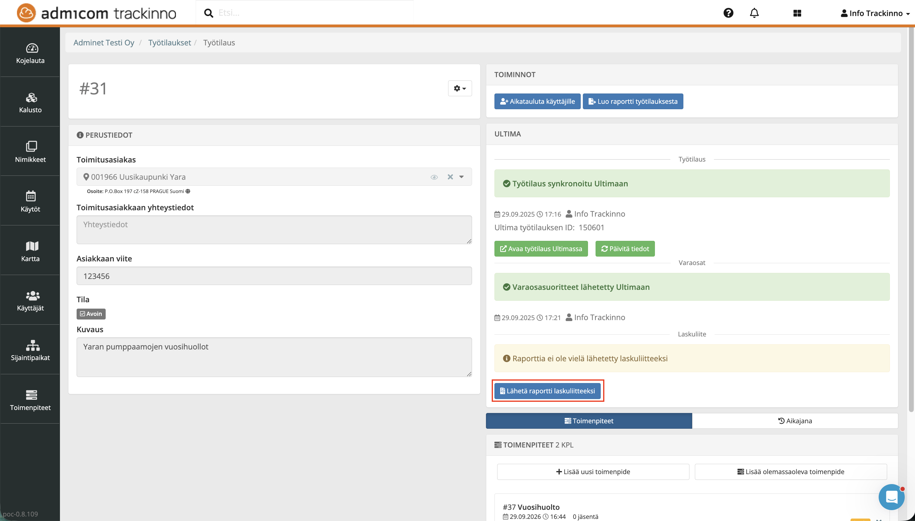 - Trackinnon tarkastuspöytäkirjat voidaan siirtää automaattisesti rajapinnan kautta Ultiman laskuliitteiksi (ks. kuva alla).