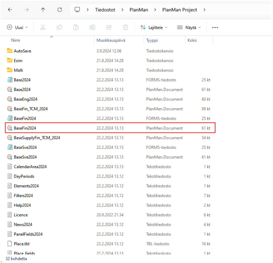 - Ota kopio PlanMan Projectin käyttäjäkansion BaseFin2024 tiedostosta (ruotsi: BaseSve2024, englanti: BaseEng2024). Käyttäjäkansio löytyy osoitteesta: C:\Users\”käyttäjä”\Documents\PlanMan\PlanMan Project.