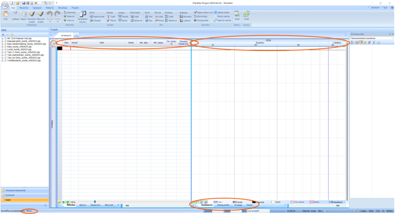 Suomen kieli valittuna PlanMan Project käyttää automaattisesti käyttäjäkansiosta löytyvän BaseFin2024 (ruotsi: BaseSve2024, englanti: BaseEng2024) -tiedostoa pohjana. Aina kun käyttäjä avaa tyhjän projektin, on siis uusi pohjaprojekti käytettävissä. Tällöin mm. taulukko- ja janakaavio-osio tulisi näkyä ao. mukaisesti.