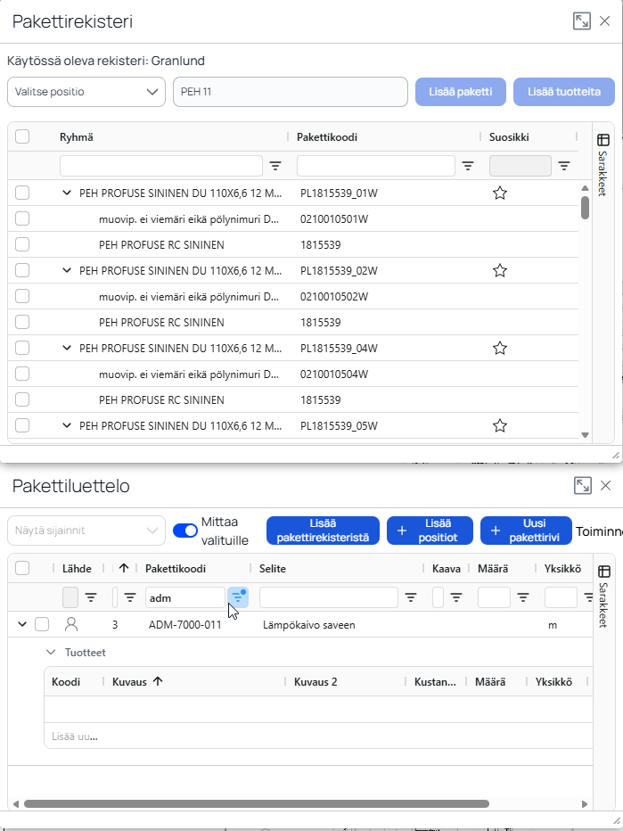 HUOM! Et voi lisätä pakettirekisteristä tuotuun pakettiin lisää tuotteita.