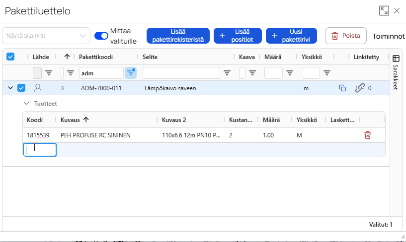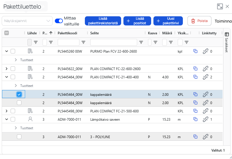 - Mittaukset linkittyvät pakettiriveihin ja määrät siirtyvät automaattisesti.