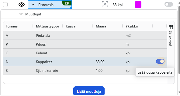 Ne ilmestyvät Mittausluetteloon valitulla nimellä ja värillä
