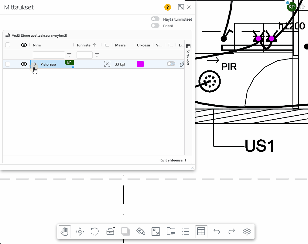 Hahmontunnistusta käytetään kappale mittausten tekemiseen suoraan piirustuksesta. Toiminto tunnistaa samanlaisia objekteja (esim. pistorasioita) ja luo niistä automaattisesti mittauksia.