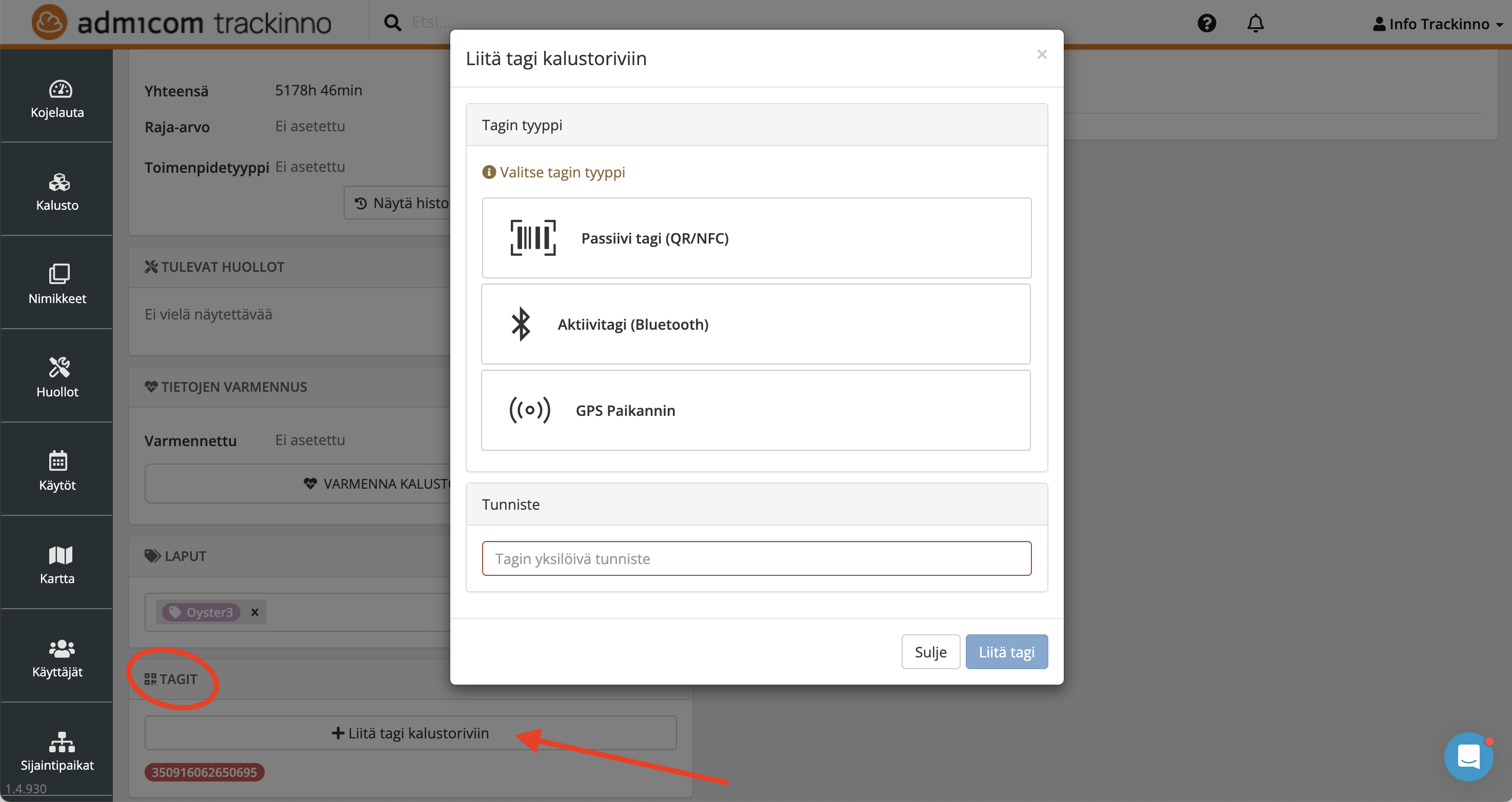 - Siirry kohtaan Tagit ja klikkaa “Liitä tagi kalustoriviin”.