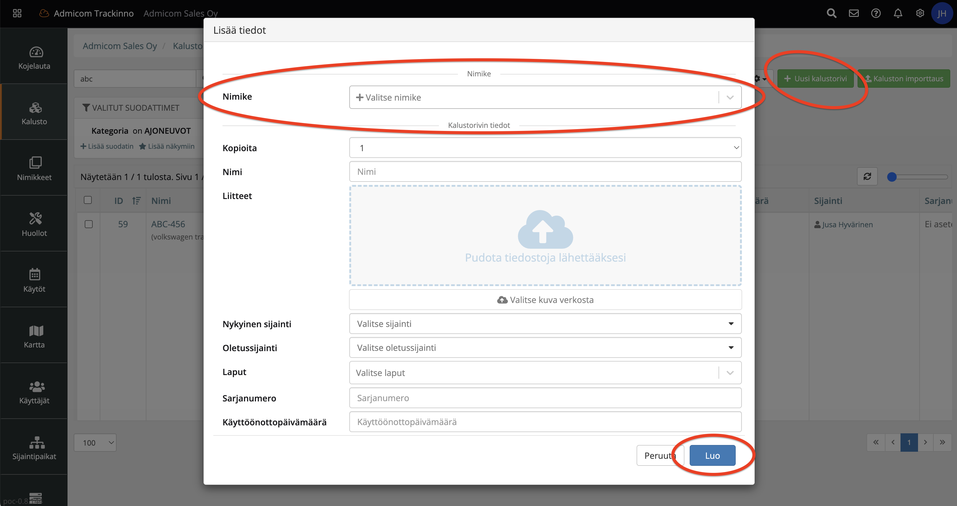 Vinkki: Kalustorivin voi luoda myös samalla, kun linkität tagin tai GPS-paikantimen.